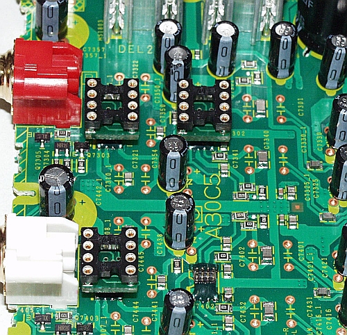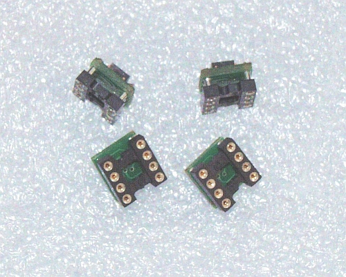 Die alten SMD OP´s ausgelötet statdessen einen speziellen 8PIN-µStecker eingelötet (bei diesem Board waren 4 OP´s zu tauschen). Dann kleine Adapter mit µBuchsen, passend zu den o.g. 8PIN-Steckern, einer von uns entworfenen Platine und einem normalen DIL8-Adapter mit gedrehten und vergoldeten PIN´s, angefertigt. Nach der "Anprobe" wurde zur Fixierung der µStecker noch vergossen.