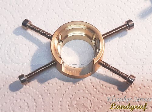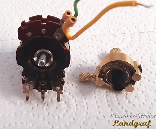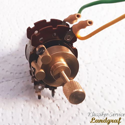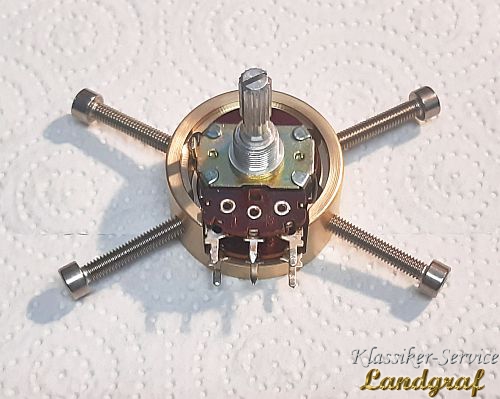 Es gibt Potentiometer die ohne entsprechendes Werkzeug nicht schadensfrei zu zerlegen sind. Auf dem unteren Bild sieht man eines. Dieses Potentiometer bietet schon nach dem abnehmen des ersten Deckels schon das erste Problem. Nach dem abnehmen der hinteren Klemmscheibe (Bem: so gut wie jedes Potentiometer, das hinten eine verlackte Klemmscheibe hat ist einstellbar was auch bei der Montage nach der Überholung gemacht werden muß. Normal ist das eine fummelige und zeitraubende Angelegenheit. Wir haben uns dafür aber ein Gerät gebaut, welches die Messdaten erfasst und entsprechend schnell eingestellt werden kann....Das Gerät kommt in einem anderen Beitrag ;) ) BTT... Also der hintere Schleifermitnehmer ist nicht so einfach abnehmbar, er klemmt auf der Achse. Wenn man ihn mit Fingern oder Zange abziehen will, verbiegt sich der Träger und der Kontaktring reisst aus den Vernietungen dann ist er Schrott!. Das heisst er muß waagrecht, gleichmäßig ohne verbiegen abgezogen werden. Wir haben uns dazu einen Abzieher, speziell für diesen Träger gebaut mit dem das saubere Abziehen möglich ist. Danach ist der Hintere Poti abziehbar. Das nächste Problem ist bei diesem Potentiometer, das der vordere Poti mit falzungen auf der Achse fixiert ist, diese müssen weg und die Achse entsprechend für die Montage fixiert werden (Die Halterungen entferen wir mit einem anderen "Helferlein" siehe anderen Beitrag) Hat man nun den Potentiometer zerlegt, überholt und die Ringe versiegelt und hat den vorderen Potentiometer fixiert zusammengebaut, den hinteren teilmontiert und engestellt, muß die hintere Kappe wieder drauf. Das geht nicht so einfach, denn für die Laschen ist nur so viel Platz das sie in ihrer Dicke gerade so reinpassen. Einfach so reindrücken "per Hand", verformt die Kappe und sie hat dann Kontakt zur R-Bahn. Folge, der Poti hat Masseschluß und geht nicht, wenn es blöd läuft wird die R-Bahn sogar beschädigt. Wir haben uns desshalb eine "Form" gebaut, mit der man diese Kappe gleichmäßig und ohne Beschädigung/Verformung wieder schließen kann.