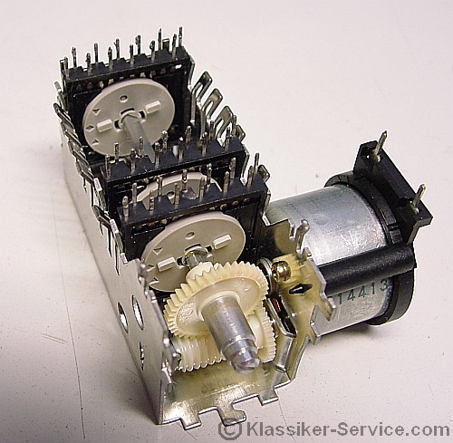 Normaler motorgetriebener Stereo - Inputselector mit Zählscheibe zur Positionserkennung. Durch diese Konfiguration muß nach Neustert des Gerätes ein Positionserkennungslauf durchgeführt werden. Dabei werden die Impulse vom Prozessor ausgewertet und zwischengespeichert. Der Nachteil ist der höhere Verschleiss, im Gegensatz zur BCD-Version und das bei Kontaktproblemen auf dieser Scheibe nicht nur die Position nicht mehr erkannt wird sondern nach Initialisierungslauf, der Motor ins Endlose weiterdreht und dabei beschädigt werden kann ( ggf auch die im inneren befindliche Rutschkupplung). Beim Zusammenbau sollte man darauf achten, die Scheiben, welche unterschiedlich sind, nicht zu verwechseln !