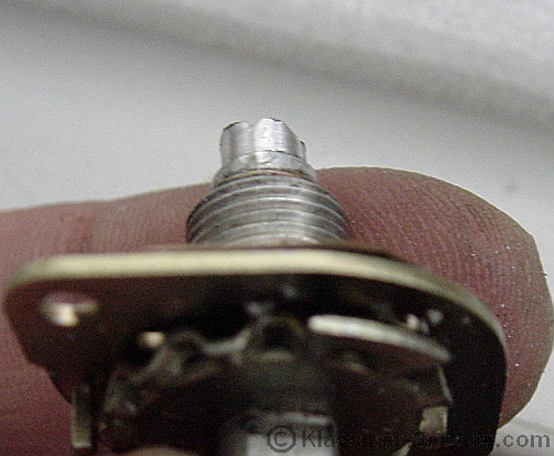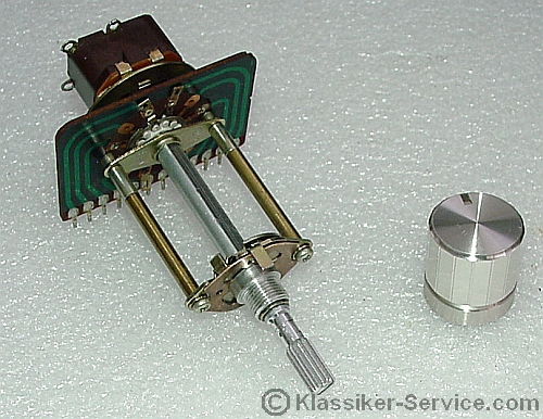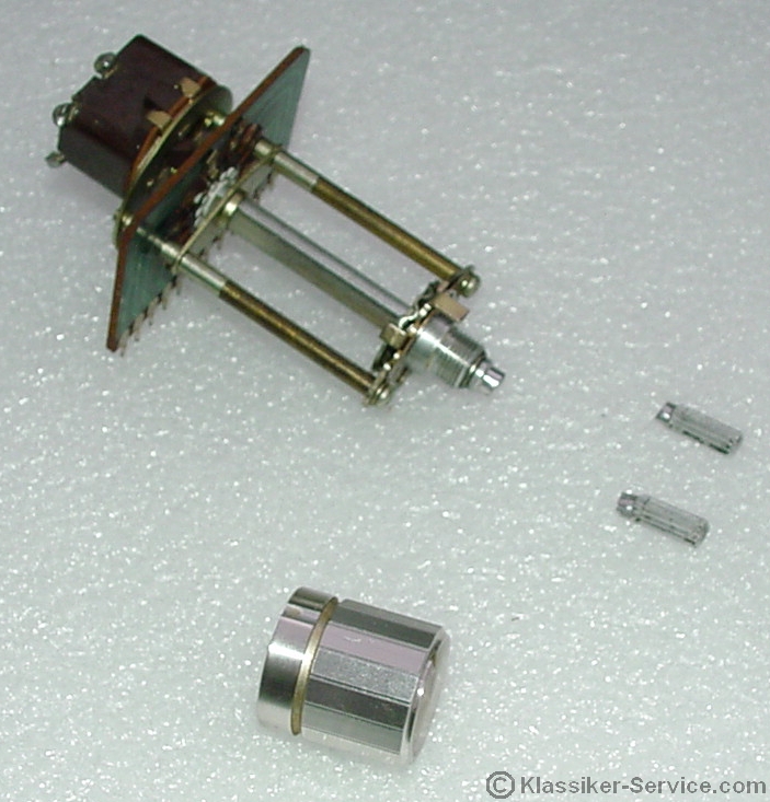 Spezieller Drehschalter der einen zusätzlichen "AUS"-Schalter besitzt. DIeser ungewöhnliche Schalter war in einem Gerät verbaut, dessen Achsöl so verharzt und schwergängig war, das der Kunde beim Einschaltversuch, die Achse abgerissen hat. Wir haben den Schalter zerlegt, gereinigt, neues Achsöl verwendet. Danach eine komplette neue Achse angefertigt. Grundsätzlich sollte man bei Klassikern immer darauf achten, daß die Schalter ohne Gewalt zu drehen sind denn dann ist ein weiterer Schaden vorprogrammiert. Auch das zu leichte drehen weist auf einen Schaden hin, nämlich das ölen des Vorvesitzers mit ungeeignetem Öl !