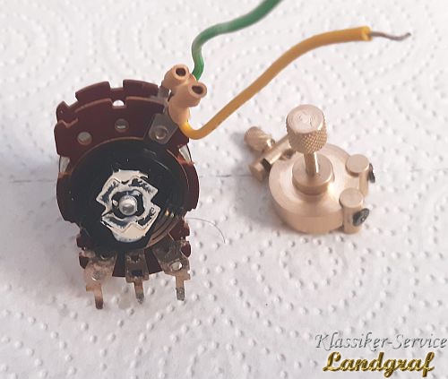 Es gibt Potentiometer die ohne entsprechendes Werkzeug nicht schadensfrei zu zerlegen sind. Auf dem unteren Bild sieht man eines. Dieses Potentiometer bietet schon nach dem abnehmen des ersten Deckels schon das erste Problem. Nach dem abnehmen der hinteren Klemmscheibe (Bem: so gut wie jedes Potentiometer, das hinten eine verlackte Klemmscheibe hat ist einstellbar was auch bei der Montage nach der Überholung gemacht werden muß. Normal ist das eine fummelige und zeitraubende Angelegenheit. Wir haben uns dafür aber ein Gerät gebaut, welches die Messdaten erfasst und entsprechend schnell eingestellt werden kann....Das Gerät kommt in einem anderen Beitrag ;) ) BTT... Also der hintere Schleifermitnehmer ist nicht so einfach abnehmbar, er klemmt auf der Achse. Wenn man ihn mit Fingern oder Zange abziehen will, verbiegt sich der Träger und der Kontaktring reisst aus den Vernietungen dann ist er Schrott!. Das heisst er muß waagrecht, gleichmäßig ohne verbiegen abgezogen werden. Wir haben uns dazu einen Abzieher, speziell für diesen Träger gebaut mit dem das saubere Abziehen möglich ist. Danach ist der Hintere Poti abziehbar. Das nächste Problem ist bei diesem Potentiometer, das der vordere Poti mit falzungen auf der Achse fixiert ist, diese müssen weg und die Achse entsprechend für die Montage fixiert werden (Die Halterungen entferen wir mit einem anderen "Helferlein" siehe anderen Beitrag) Hat man nun den Potentiometer zerlegt, überholt und die Ringe versiegelt und hat den vorderen Potentiometer fixiert zusammengebaut, den hinteren teilmontiert und engestellt, muß die hintere Kappe wieder drauf. Das geht nicht so einfach, denn für die Laschen ist nur so viel Platz das sie in ihrer Dicke gerade so reinpassen. Einfach so reindrücken "per Hand", verformt die Kappe und sie hat dann Kontakt zur R-Bahn. Folge, der Poti hat Masseschluß und geht nicht, wenn es blöd läuft wird die R-Bahn sogar beschädigt. Wir haben uns desshalb eine "Form" gebaut, mit der man diese Kappe gleichmäßig und ohne Beschädigung/Verformung wieder schließen kann.